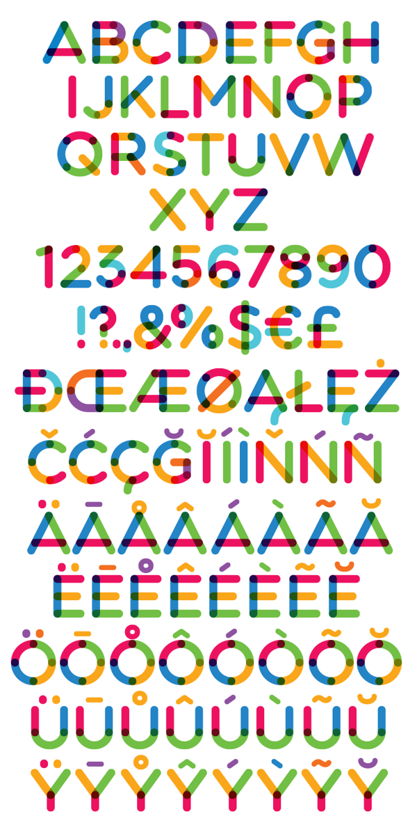 With Multicolore font you can easily create short texts for headlines, posters or whatever. Or simply stack few characters to create some random art!